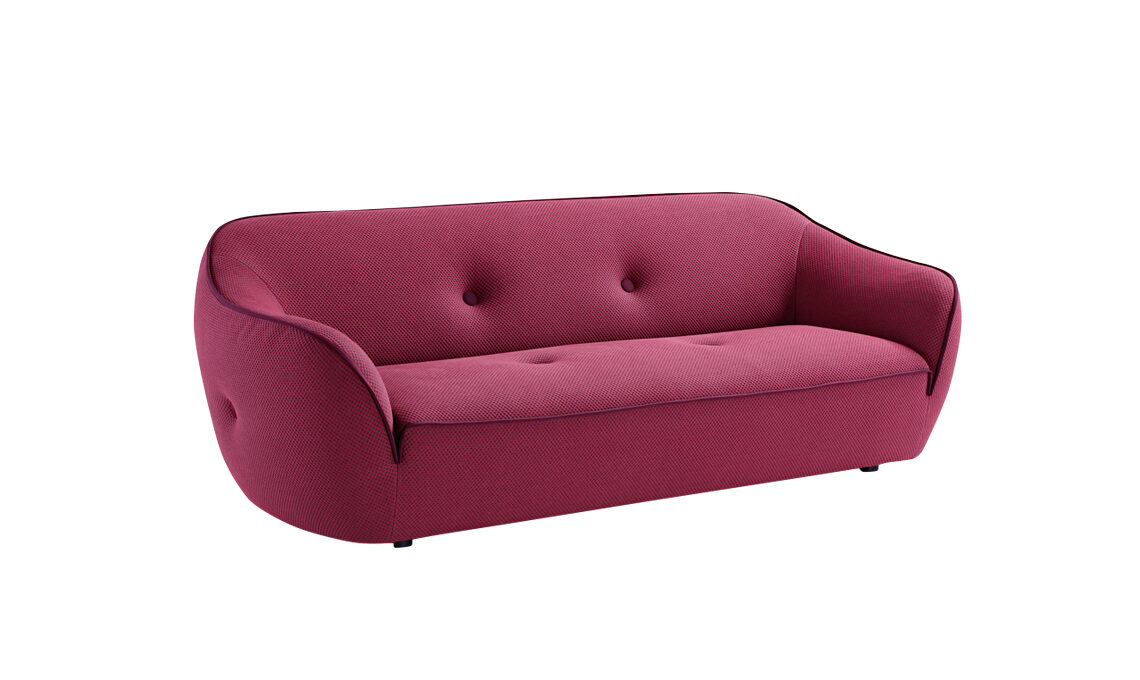 Doppio rivestimento. Struttura in abete massiccio e multistrato di pino rivestiti in tessuto Giada, cuscini di seduta a materasso e di schienale centrale in tessuto Daria Shima [Roche Bobois, cm 240x97x69h]