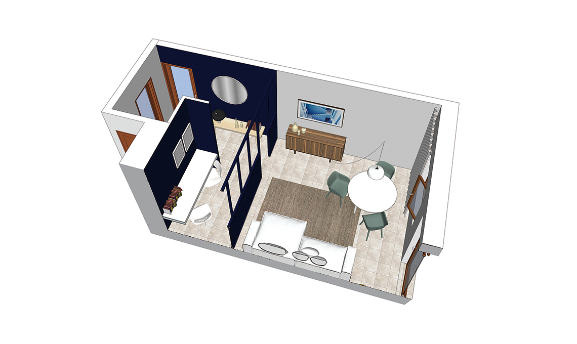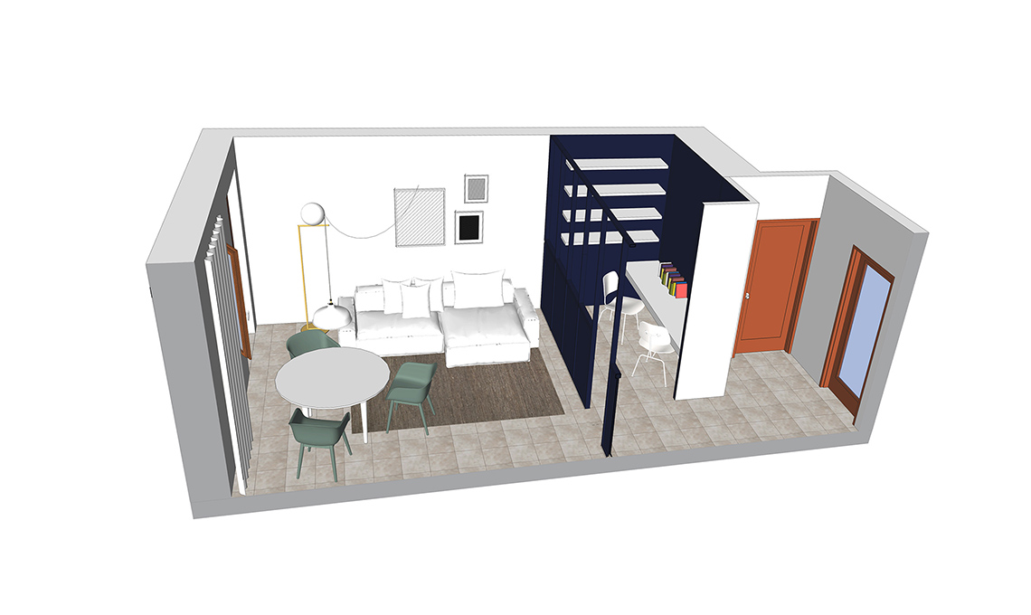 1 • Con un divisorio in legno (dipingilo poi di blu, come le altre pareti) puoi separare il salotto senza alzare muri.