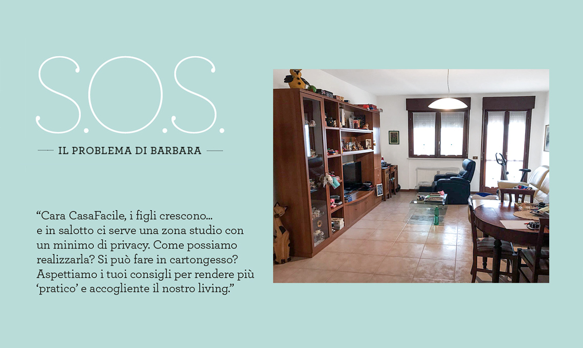 La richiesta di aiuto, questa volta, arriva da Barbara che deve creare uno studio sfruttando parte del salotto. La nostra Stylist Greta Cevenini ha studiato una soluzione che divide nettamente lo spazio senza ricorrere a muri in cartongesso.