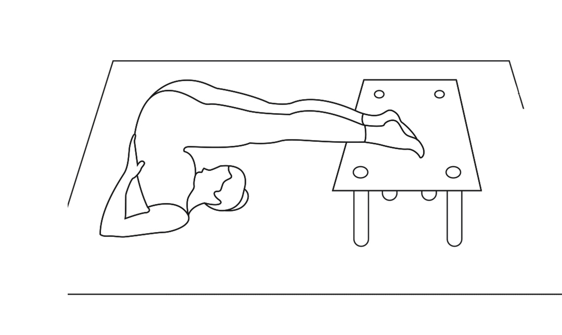 Parti distesa sul tappeto, schiena a terra, a circa 20 cm di distanza dal tavolino, con la testa rivolta verso di esso. Solleva le gambe a 90 gradi e mantieni per dieci respiri, poi solleva anche i glutei e la schiena mettendo le mani dietro la schiena a sostegno, gomiti larghi quanto le spalle. Solleva la schiena il più possibile, portando il mento sullo sterno e appoggia le gambe sul tavolino. Mantieni per 15/20 respiri. L’utilizzo di un supporto rende la posizione accessibile a tutti ed evita di sovraccaricare il collo. Nella posizione finale, i piedi devono scendere a terra oltre la testa.