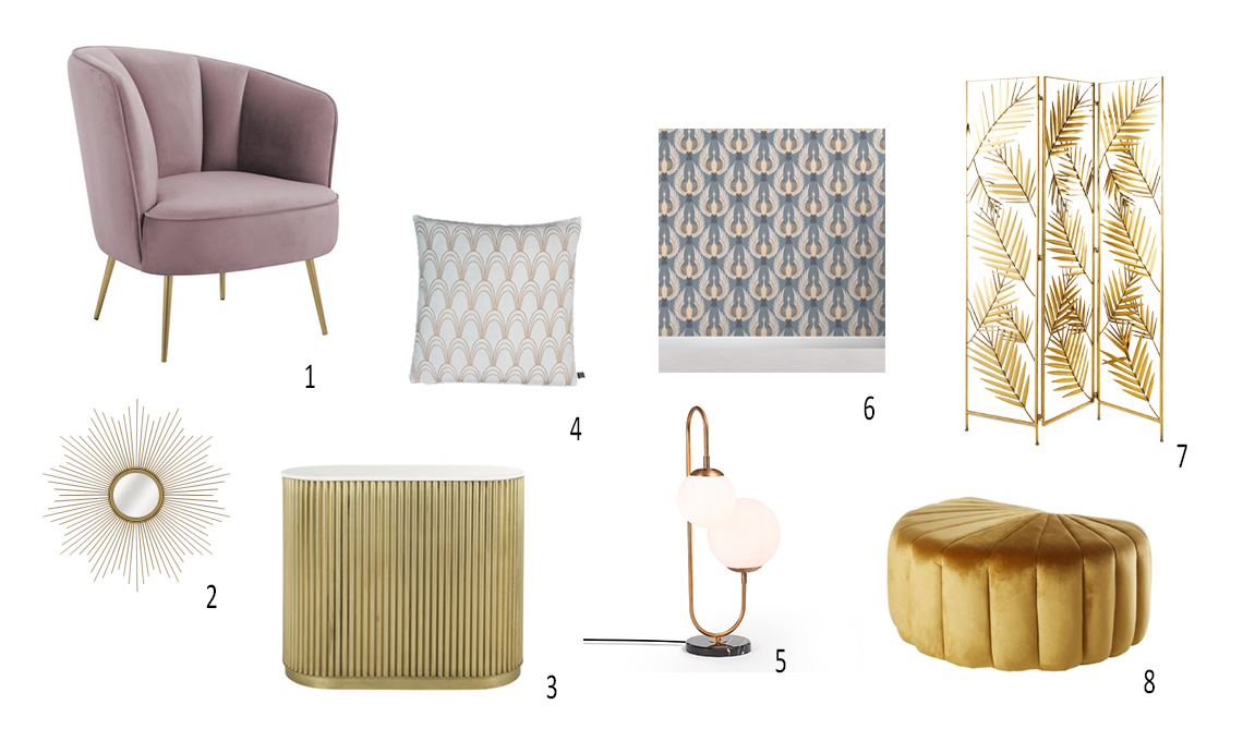 1. Poltrona in velluto Louise [Westwing]; 2. Specchio a parete tondo Sun [Leroy Merlin]; 3. Louxor, Mobile bar in metallo ondulato [Maisons du Monde]; 4. Federa in velluto con motivo Art Deco [Westwing]; 5. Lampada Flai [Sklum]; 6. Carta da parati con gru [Murals Wallpaper]; 7. Selena, paravento foglie in metallo [Maisons du Monde]; 8. Pouf conchiglia in velluto [Maisons du Monde].