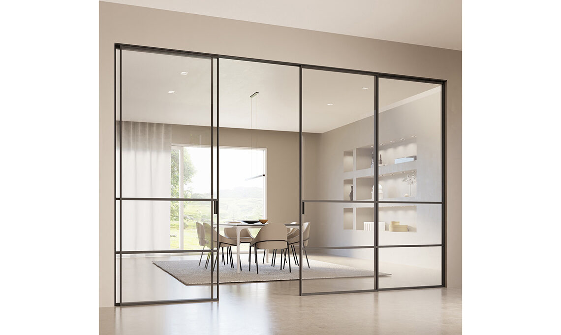 Cristallo trasparente e alluminio per il sistema scorrevole modulare Scenario Delineo Industrial [Ferrerolegno].
