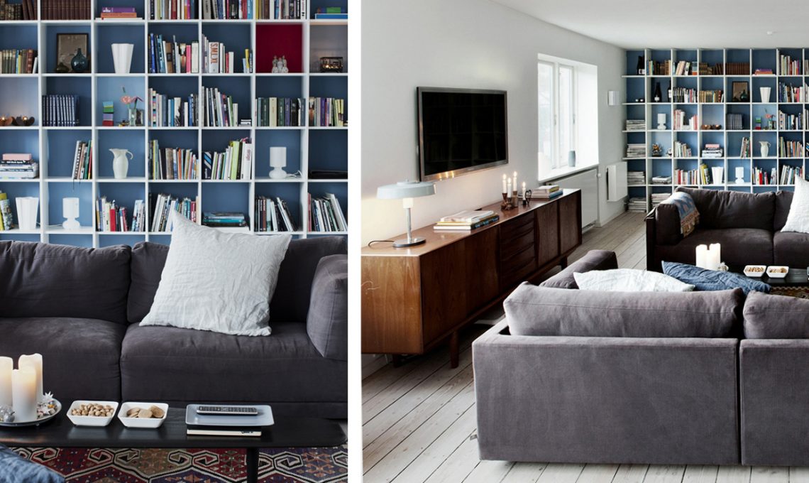 Gli scaffali bianchi acquistano carattere grazie al fondale azzurro polvere. Il trucco per rendere la parete leggera è alternare libri a vasi e lampade: in particolare gli oggetti bianchi creano un effetto molto equilibrato. [Foto: Martin Sølyst/Erik Bjorn/Living Inside]