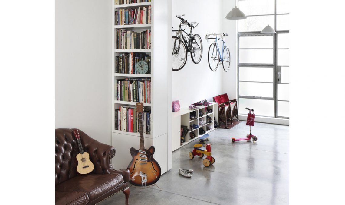 Nell’ingresso, una parete completamente bianca con due ganci per appendere le biciclette. In questo modo la funzione pratica (in mancanza di un garage) si unisce all’estetica, perché le bici diventano parte attiva della decorazione dell’ambiente. [Foto: Alexander James/The Interior archive]