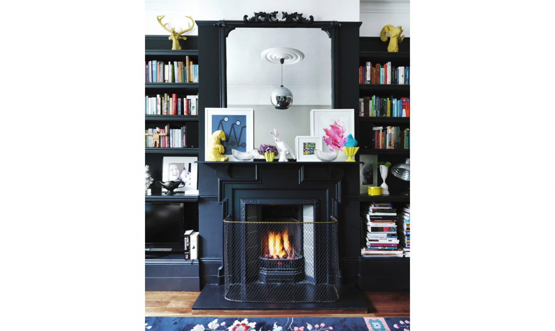 Una boiserie in legno laccato nero fa da fondale allo scenografico camino. Per sdrammatizzare l’effetto dei toni scuri, un grande specchio in cui si riflette la stanza, tanti oggetti e stampe con colori accesi dominanti, qualche tocco di bianco e, naturalmente, tanti libri dai dorsi multicolore! Guarda tutte le foto di questa casa [Foto: Michael Paul]