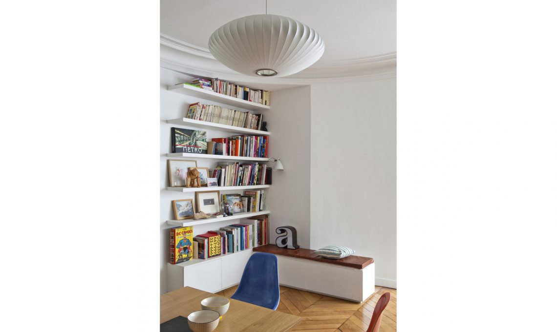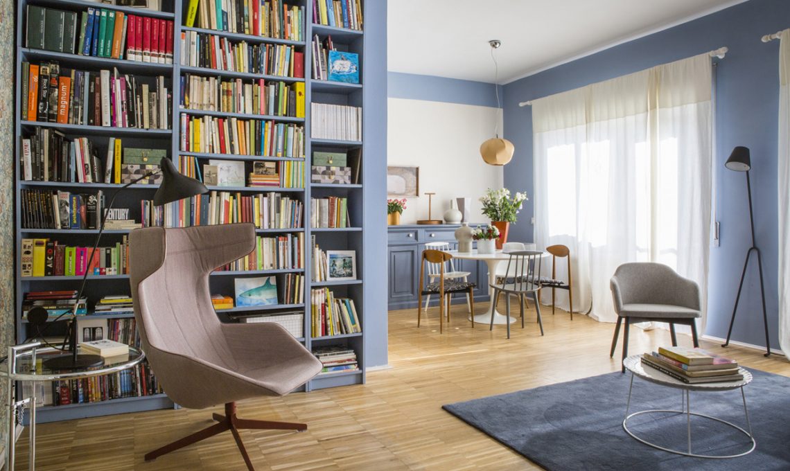 Una mezza parete a libreria, che rende più netta la divisione tra sala da pranzo e soggiorno, senza intaccare la luminosità complessiva dell’ambiente e creando allo stesso tempo un angolo relax, ideale per passare il tempo libero immersi nella lettura di un bel libro. Guarda tutte le foto di questa casa [Foto: Serena Eller]