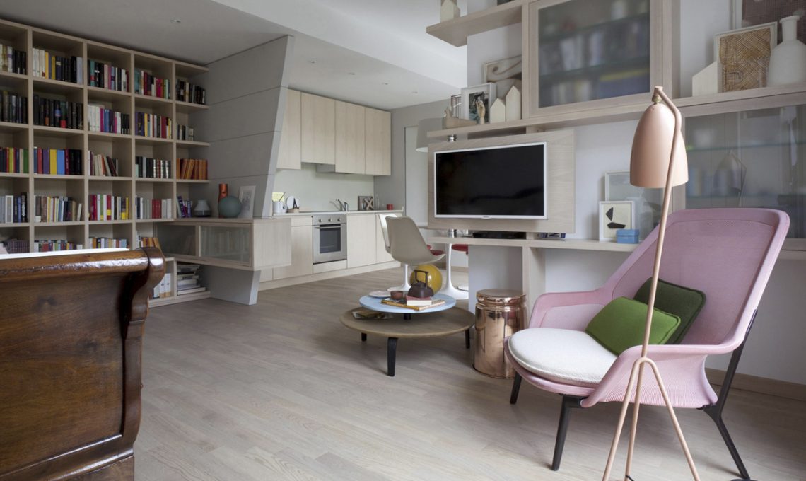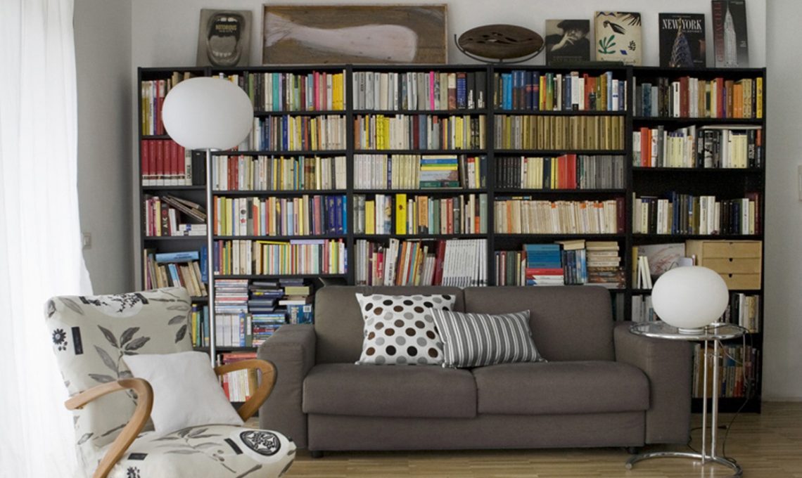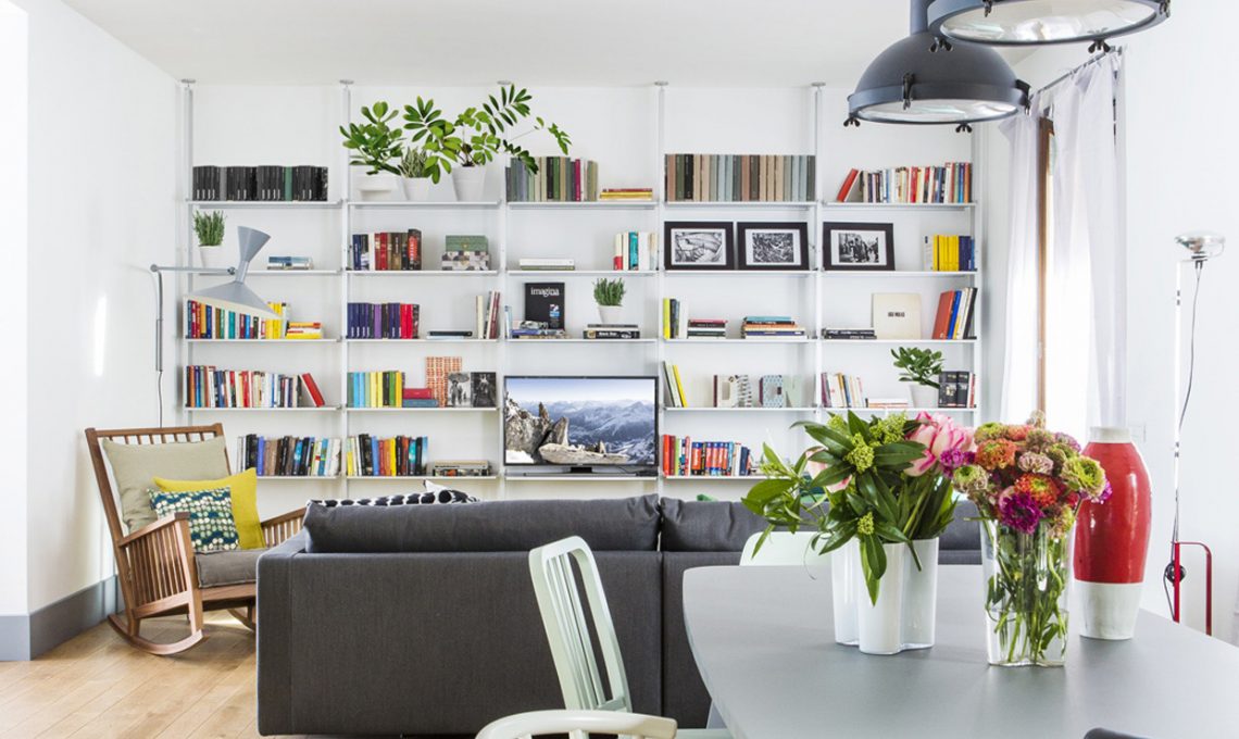 Una libreria a tutta parete che però non arriva fino al soffitto: in questo modo c’è lo spazio sufficiente per esporre quadri e stampe, anche in una casa molto piccola! [Foto: Living Inside]