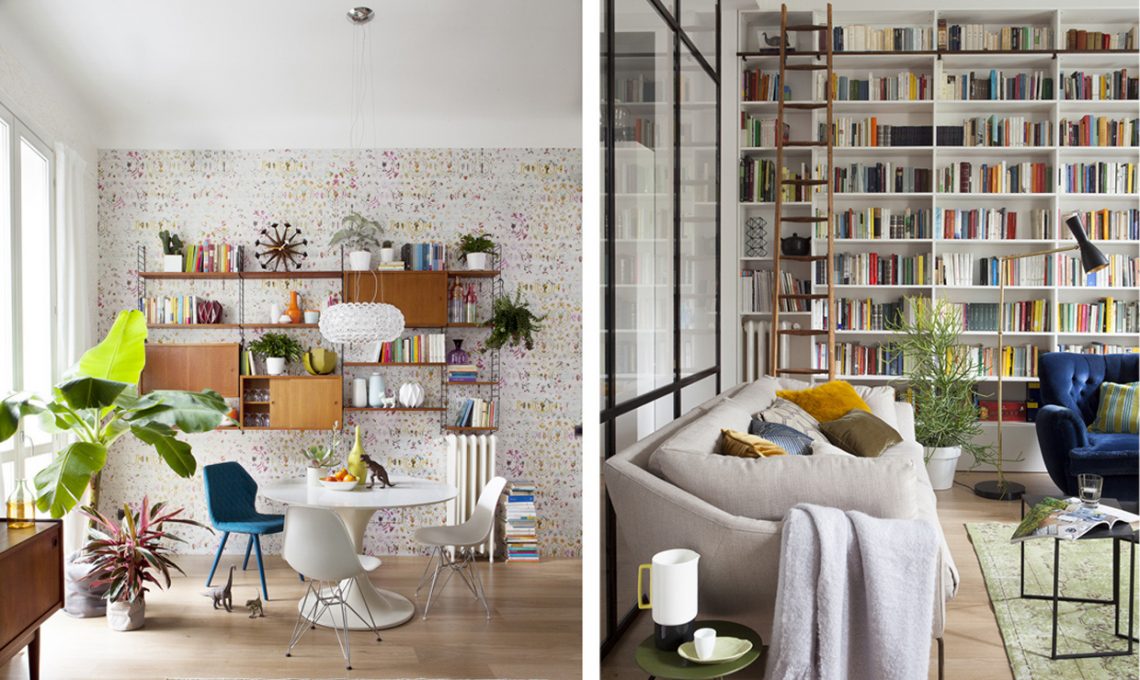 Nello stesso soggiorno, due soluzioni differenti. Da un lato una libreria anni Cinquanta in legno si staglia su una parete decorata con carta da parati dai toni pastello; dall’altro una libreria a tutta parete, dotata anche di una scala a pioli, per raggiungere i ripiani più alti. Guarda tutte le foto di questa casa [Foto: Giandomenico Frassi]