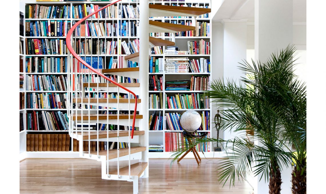 Qui la libreria fa da fondo alla bella scala a chiocciola: una soluzione molto intelligente per un bel colpo d’occhio. Guarda tutte le foto di questa casa [Foto: Pure Public/Living Inside]
