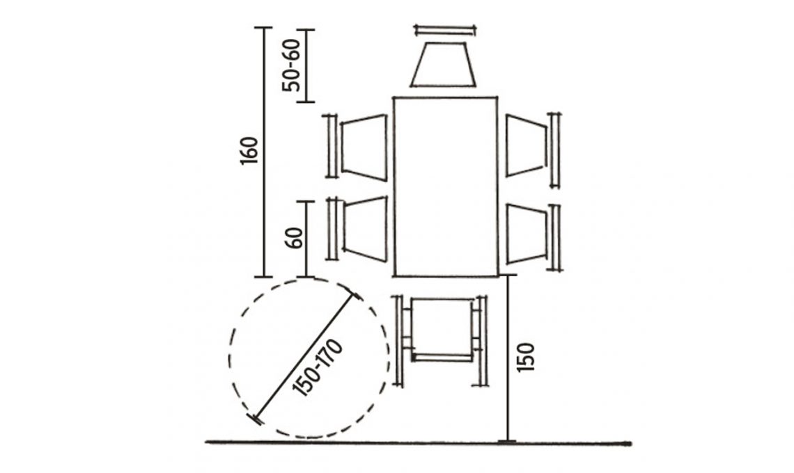 Per 2 persone il top deve avere un diametro di cm 60, per 3 di cm 80, per 4 commensali si sale a 90/110 cm, per 6 110/125; infine, per 8 occorre un tavolo da cm 150/160. Tutto attorno serve una fascia libera da cm 45/60 cm per fare accomodare e muovere le persone.