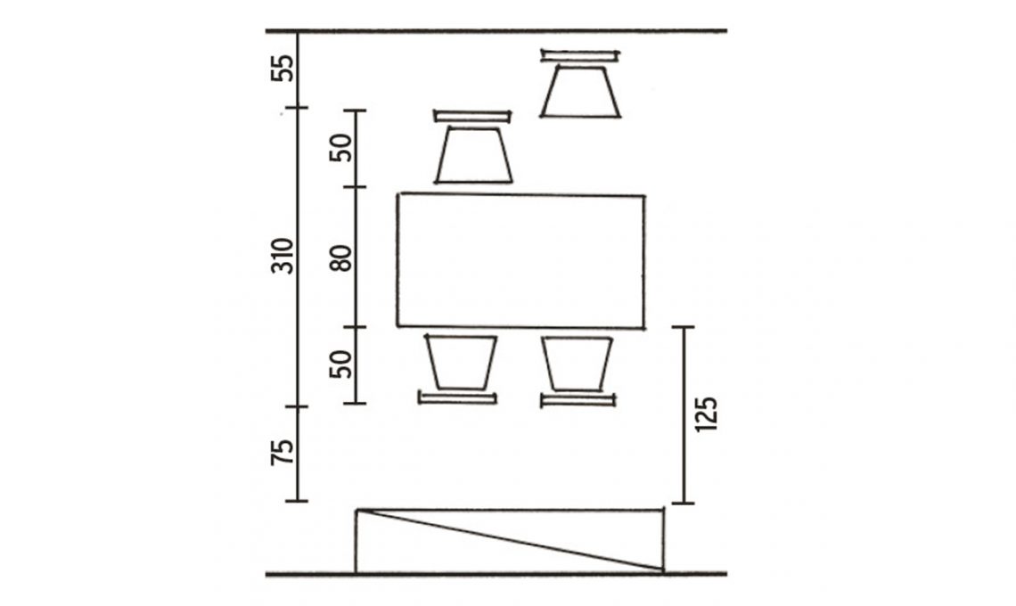 Per 4 persone deve essere da cm 140x80: si aggiungono 60 cm di lunghezza per ogni commensale in più. Tra il bordo del tavolo e la parete servono 105 cm per il passaggio