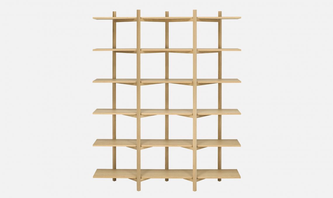 Semplice e funzionale la libreria Zig Zag in rovere massello [Hem, cm 175x33x 214h €1.199].