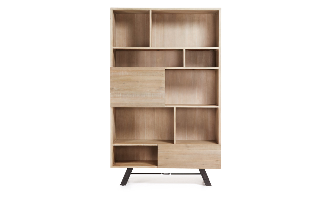 Con vani a vista e chiusi, la libreria in acacia Wooden [Cuckooland, cm 120x 40x195h €1.600].