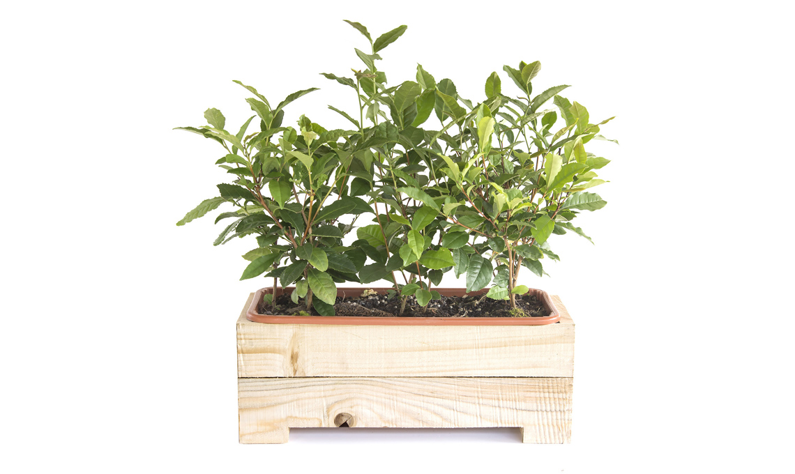 Il kit per coltivare il tè in casa comprende un vaso in legno, il terriccio e i semi [Compagnia del Lago € 70].