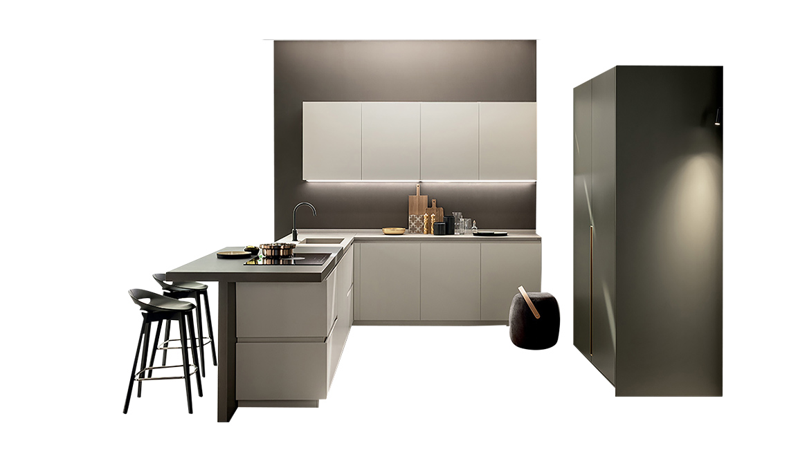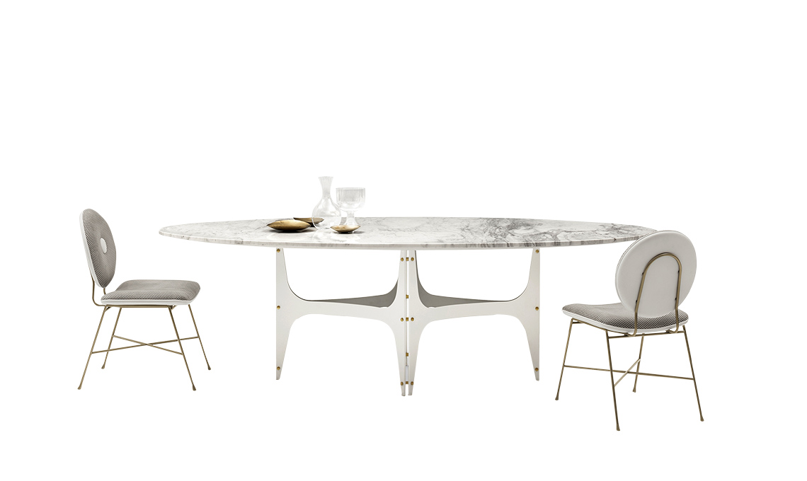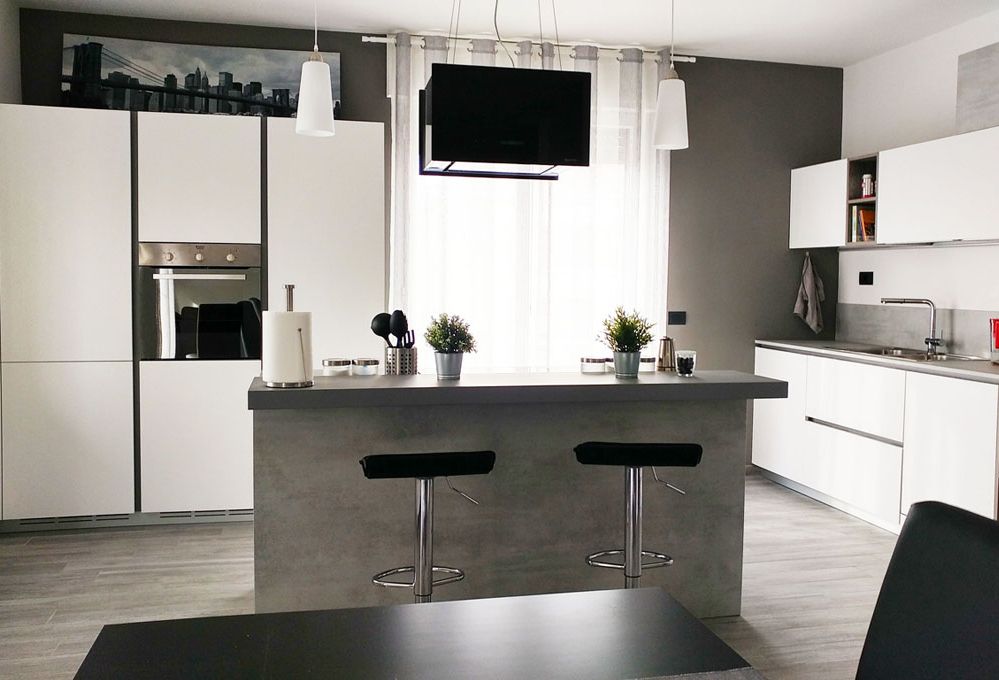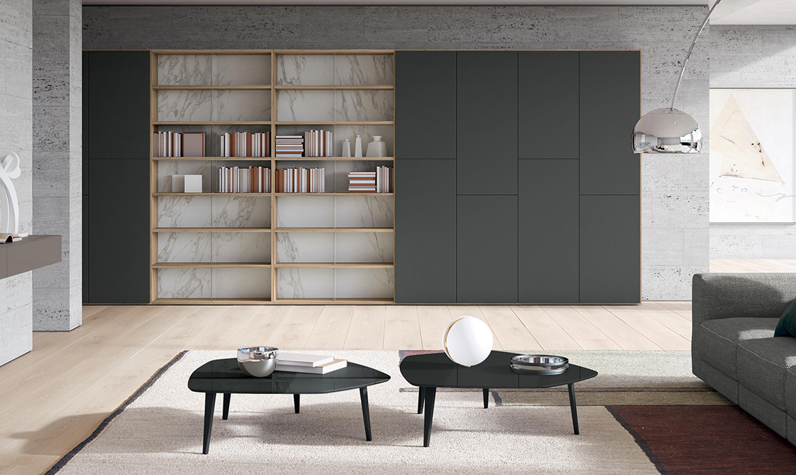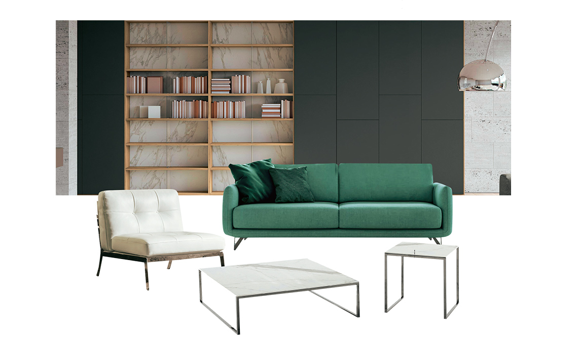 Si tratta di un grande living di 37mq che ora diventa open space, ospitando cucina, zona pranzo e relax. Ai lati della stanza (per sfruttare al massimo la luce naturale) ci sono da una parte l’angolo relax con divano, due poltrone e libreria, dall’altra la cucina con penisola con banco snack. Al centro, a fare da filtro, il grande tavolo ovale completato dal mobile bar.