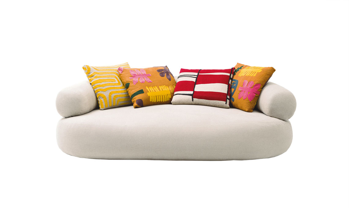 Sobi ha schienale arrotondato, con due cuscini per sostenere la schiena: schienale e braccioli sono un pezzo unico, come la base [Alf DaFrè, cm 230x93x71h]
