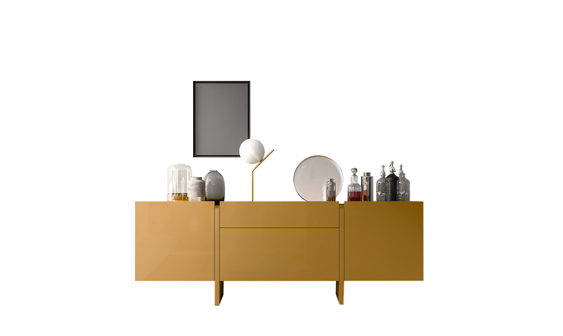 - Madia: la struttura portante di Recta fa da naturale divisorio fra le due ante laterali e il vano centrale con cassetto e cestone. Qui è in laccato lucido Curcuma, di Alf DaFrè.