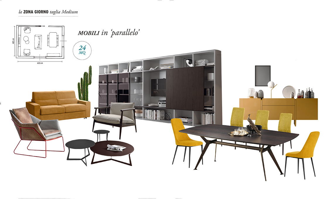 La conformazione della stanza suggerisce di sfruttare una della pareti corte con una maxi libreria con vano tv a scomparsa, di fronte un divano letto più due poltrone. Per le cene c’è il tavolo per 6/8 commensali sistemato alle spalle del sofà e completo di madia.