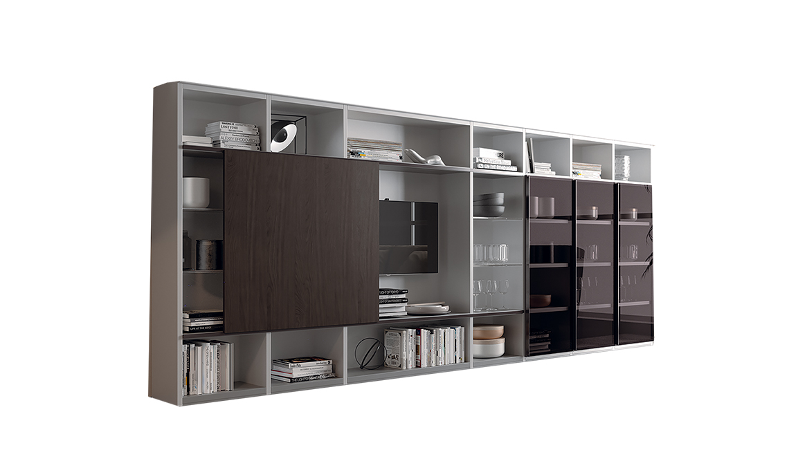 - Libreria: la composizione Living 556 di Giessegi, è in laccato opaco liscio e nobilitato Teak, più ante con telaio Bronzo e vetro Reflex. Ricorda che la libreria va organizzata in base al contenuto: se hai molti libri (anche volumi d’arte) meglio avere moduli da cm 45/60 perché i ripiani possono sopportare grandi carichi; se invece hai tanti oggetti, i moduli si possono allungare fino a 120 cm. La profondità? Bastano 30/35 cm.