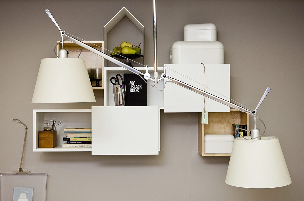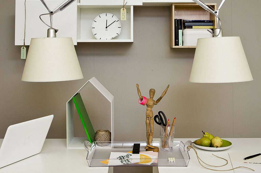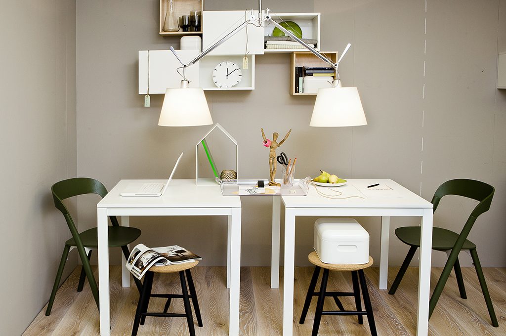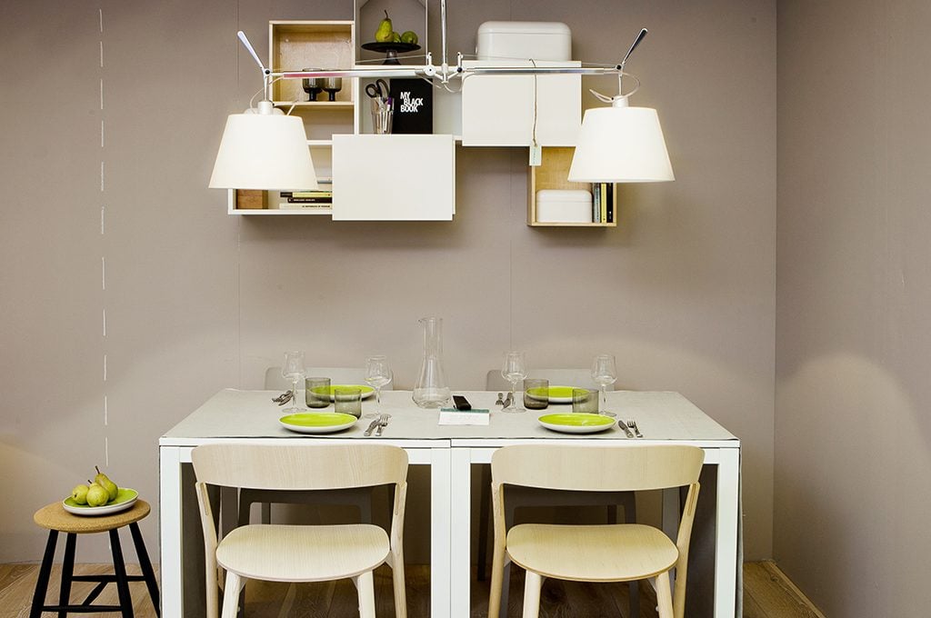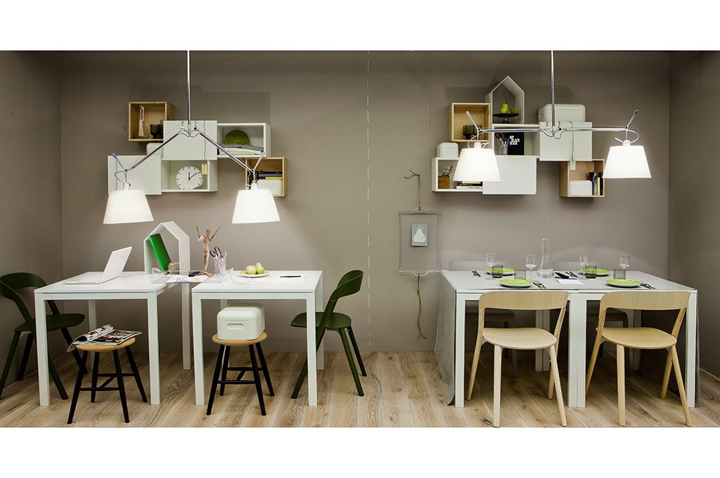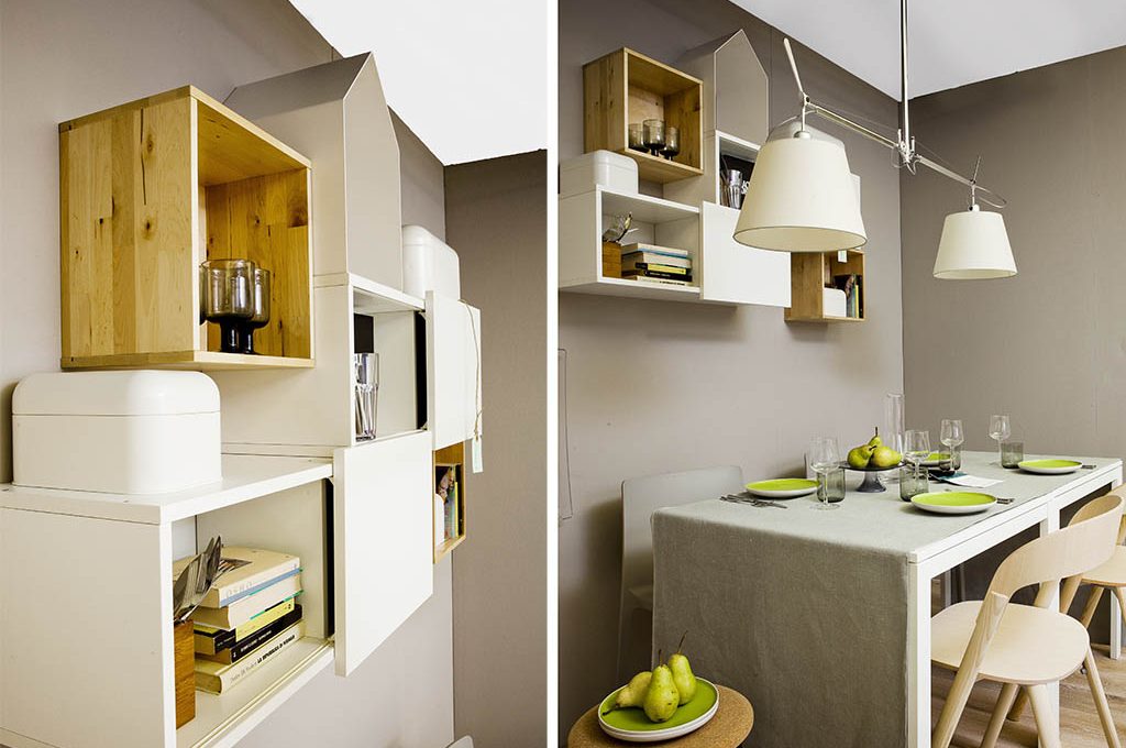 E durante la pausa pranzo? In poche mosse lo spazio si trasforma: i due tavoli si uniscono e si può apparecchiare in un attimo, grazie ai piccoli ma funzionali contenitori appesi alle pareti.