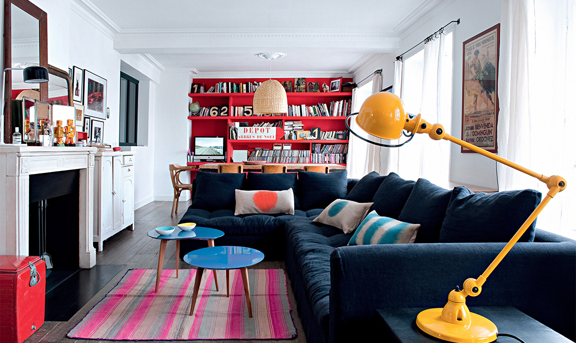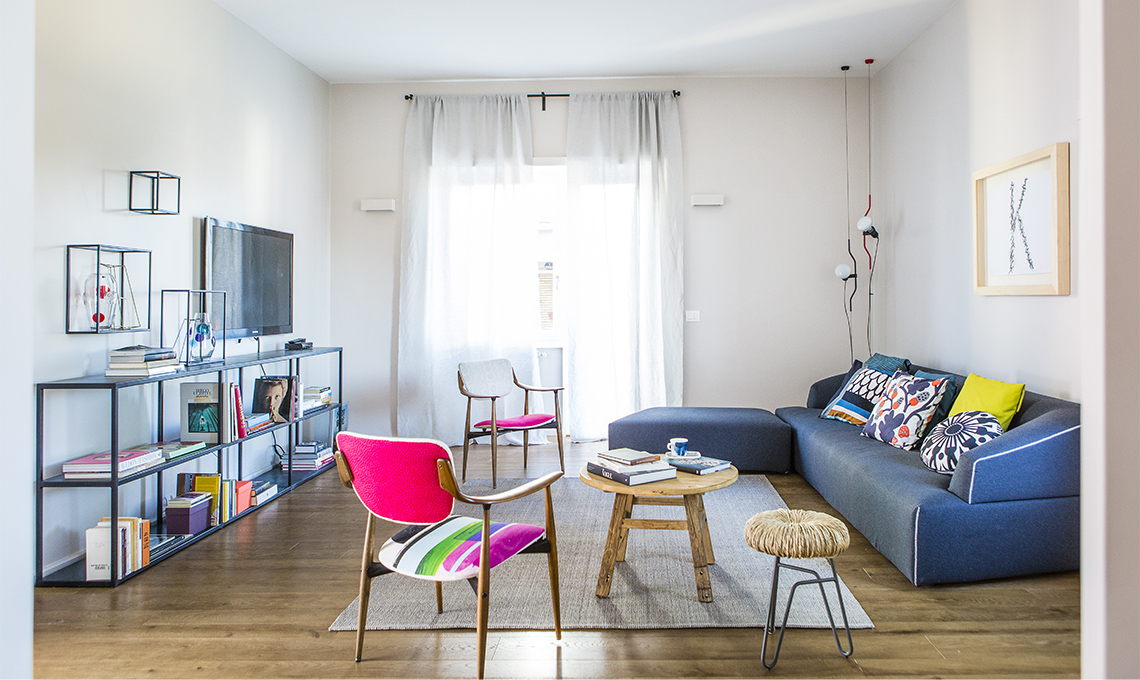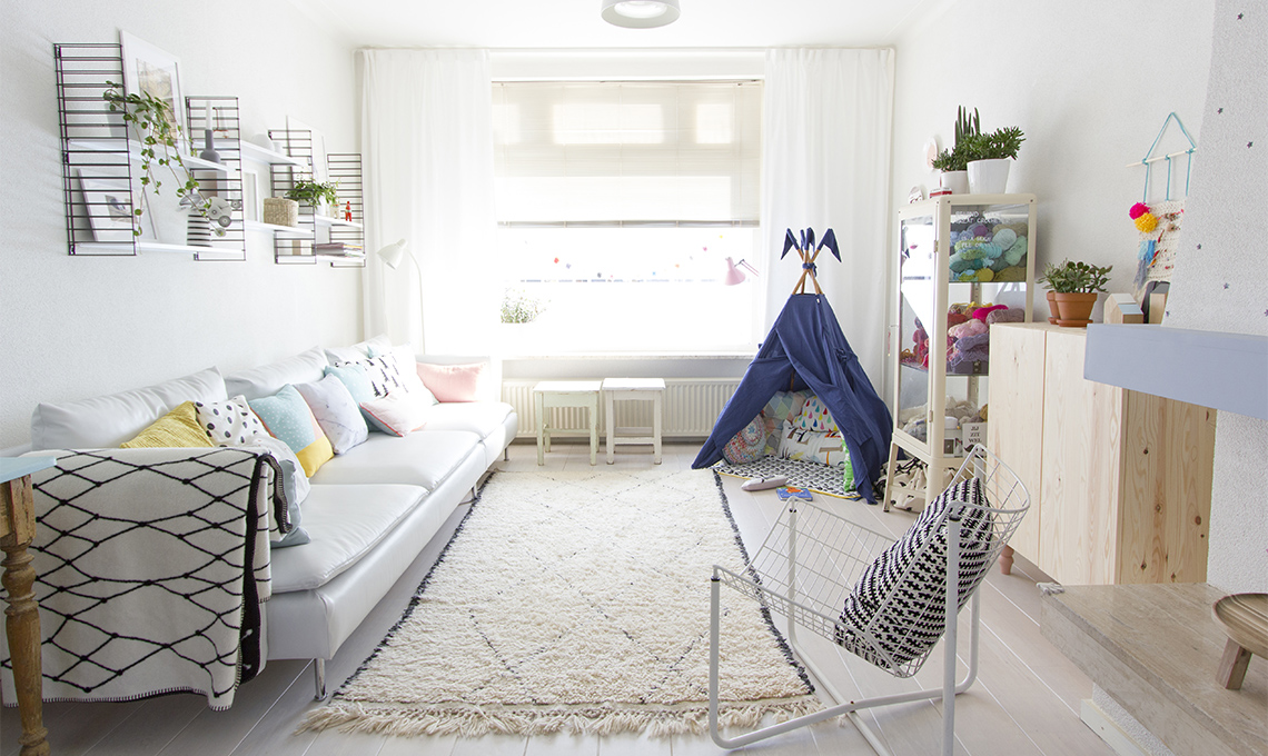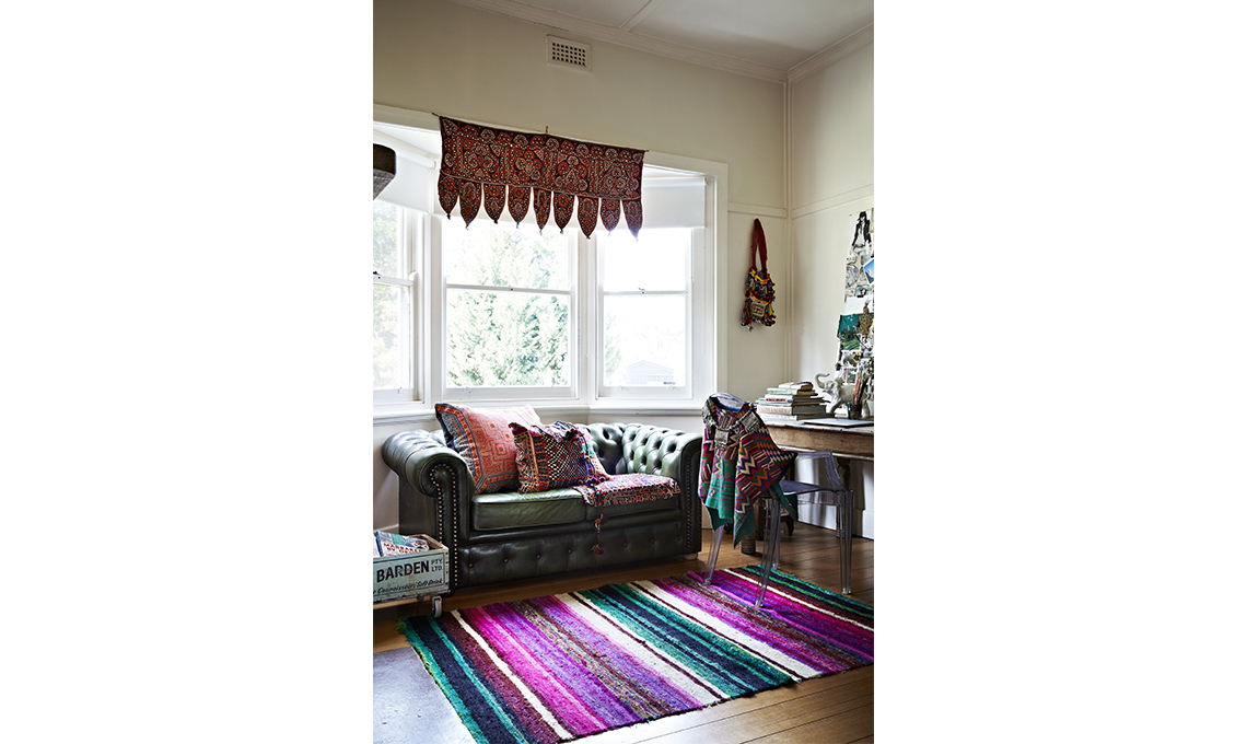 Per uno stile boho chic, la microtenda etnica, con sola funzione decorativa. Il compito di oscurare la luce è lasciato a delle tende a rullo bianche che scompaiono visivamente.