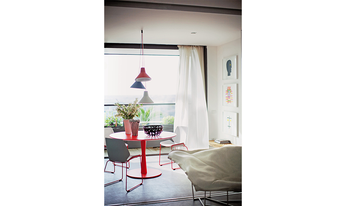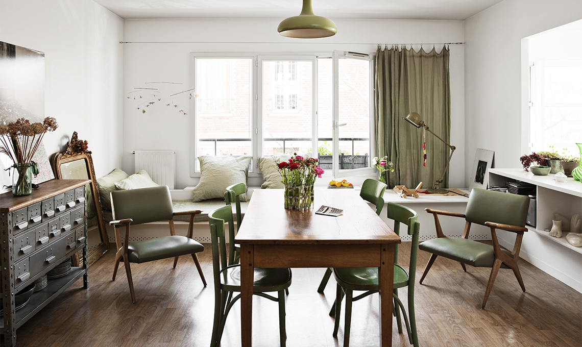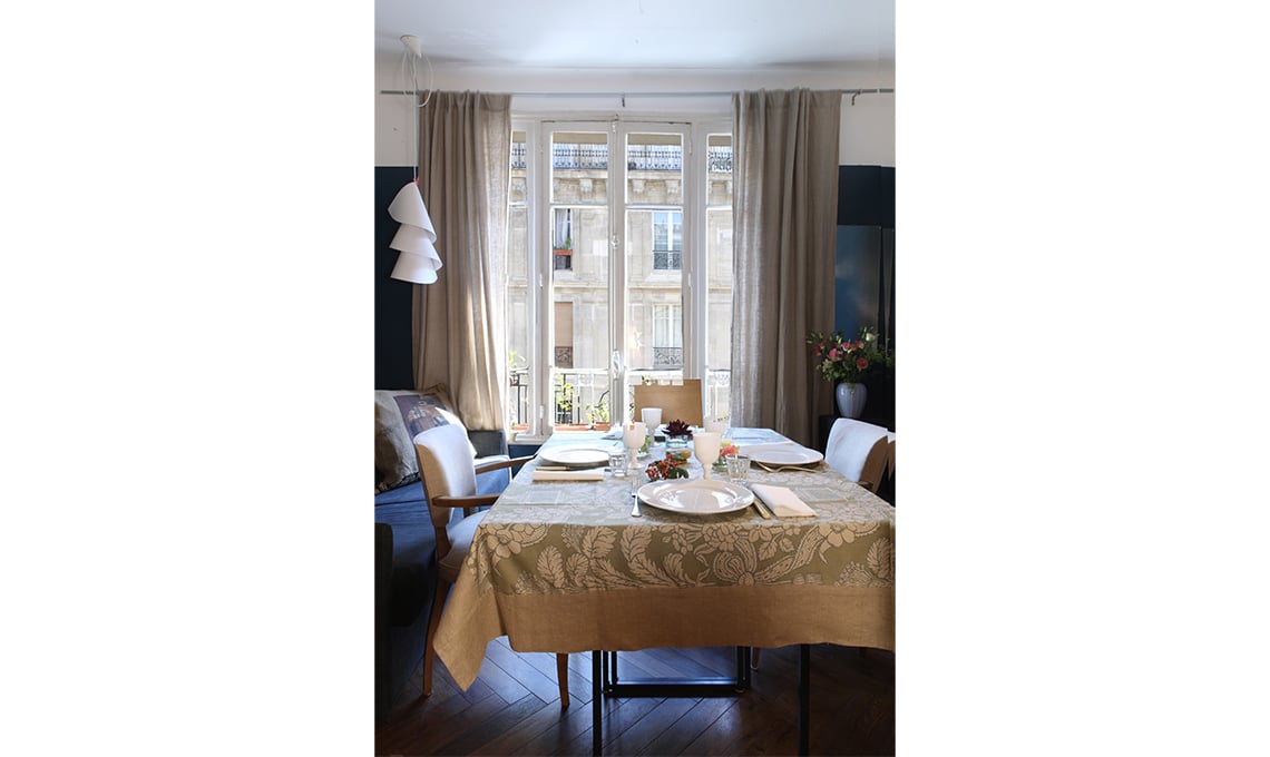 In questa zona pranzo sofisticata, arredata con pezzi di design e quadri di ispirazione giapponese, la tenda è bianca [Aina di Ikea] su bastone semplice bianco. La tenda, oltre a garantire privacy, è riflettere la luce e lasciarla in parte filtrare, senza rubare la scena.