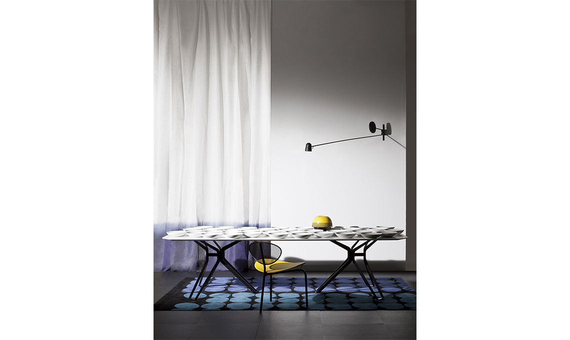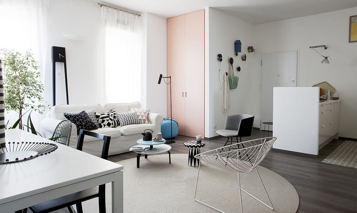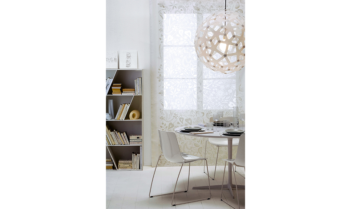 Qui la tenda, bianca e semitrasparente, lascia campo libero al gioco grafico creato dal bastone Räcka [Ikea] scelto volutamente in nero per giocare con gli elementi grafici dell'arredo (lo scaffale a giorno, le gambe di sedie e sgabello, i faretti Toyo [Flos].
