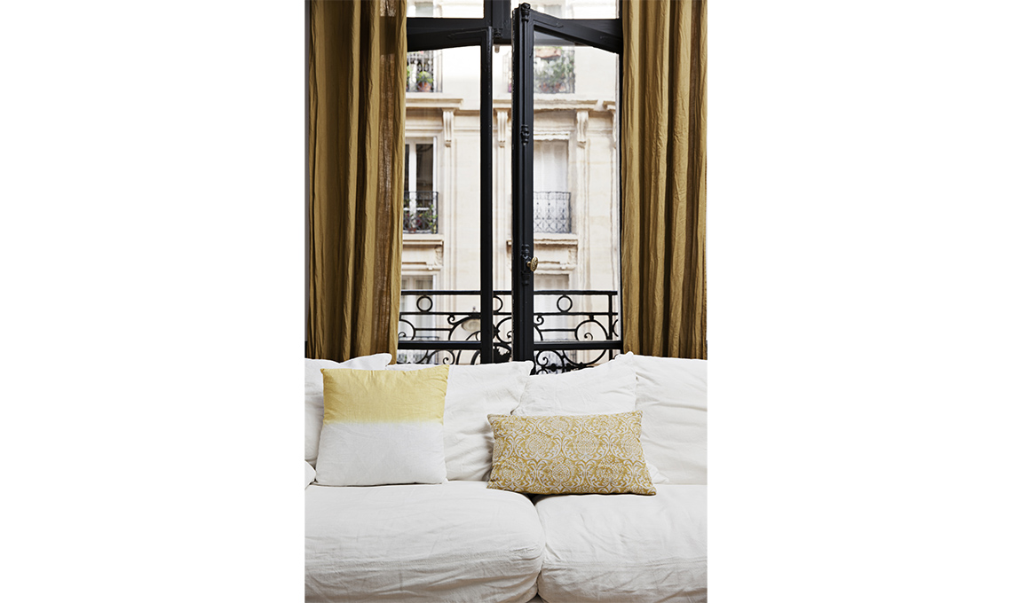 I grandi anelli a pressione inseriti nel tessuto della tenda Merete [Ikea] scorrono con facilità sul bastone in acciaio. Una soluzione pratica. Per aggiungere un tocco di eleganza, la tenda sfiora il pavimento: per un effetto simile, calcola cm 5 più della lunghezza a pavimento.