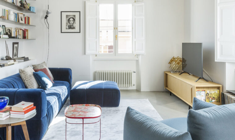 Divano Portofino in tinta neutra dal design minimal e dalle forme eleganti con sedute profonde dotate di funzionali cuscini poggiareni