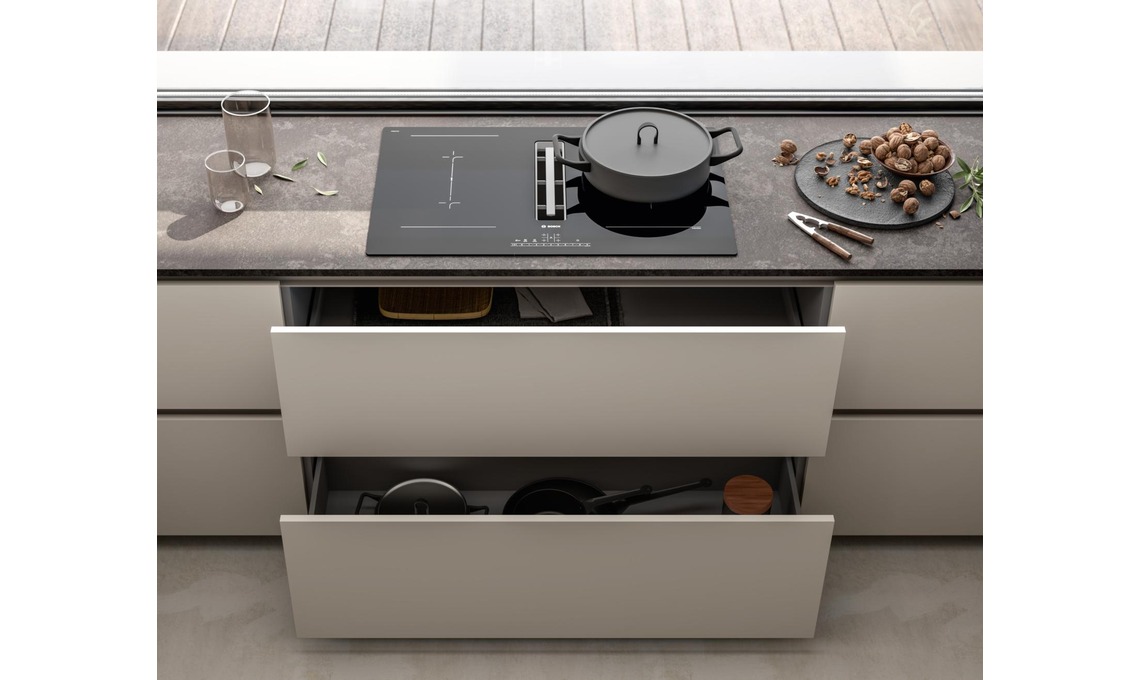 I cestoni sono perfetti per tenere a portata di mano pentole, coperchi e padelle. Se scegli il piano a induzione con cappa integrata ricordati che parte dei cassettoni non potrà essere utilizzata a causa dell’ingombro (seppur sempre minore) del motore di aspirazione.