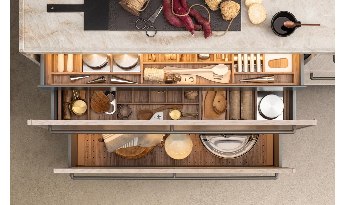 Sono strategici perché da aperti fanno vedere (e prendere) tutto il contenuto facilmente. Fai così: • non esagerare con le dimensioni (max cm 120 di larghezza) né con i carichi perché rischi di rovinare le guide (evita di tenerci le pentole in ghisa o pile di piatti pesanti); • usa sempre gli organizer, possibilmente flessibili, che aiutano a fare ordine; puoi già acquistarli insieme alla cucina così sono ‘su misura’; • meglio più cassetti non troppo alti (38-40 cm max) per suddividerne al meglio il contenuto.