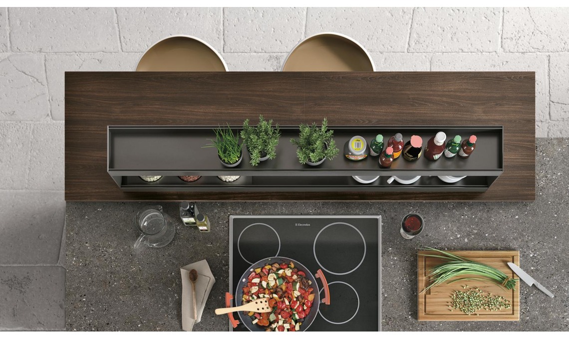 Su isola e penisola dietro lavello e fuochi devi avere ciò che ti serve per cucinare senza sparpagliarlo sul piano: ideale installare un sistema a ‘scatola’ a incasso con gli accessori per ospitare piatti, condimenti, aromatiche pronti all’uso.
