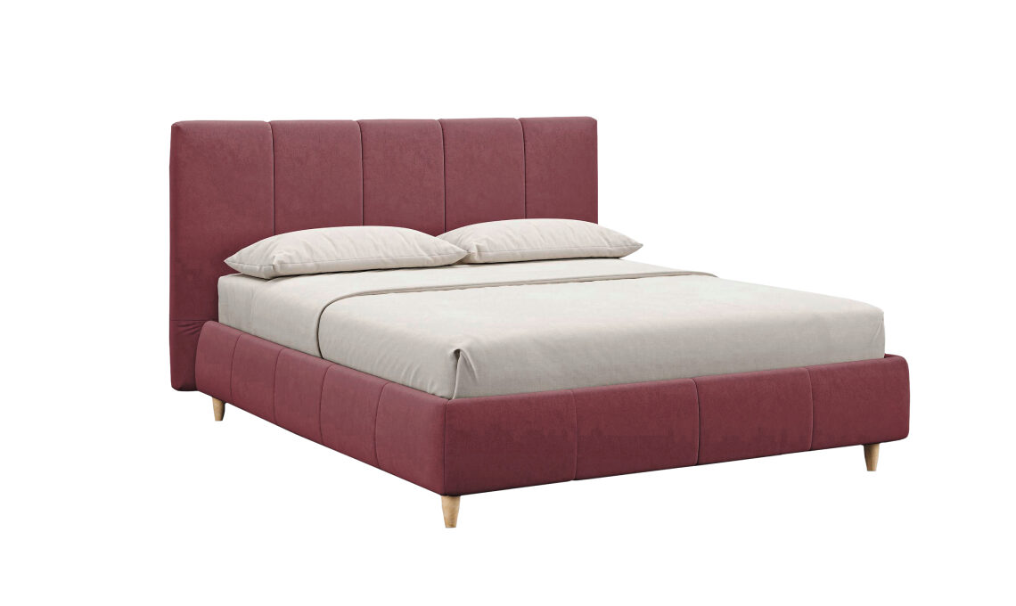 Letto contenitore imbottito Laura, con rivestimento sfoderabile in morbida microfibra di velluto. Qui è nel colore Salmone con piedini in legno naturale [Divani.Store®, cm 182x208x101h].