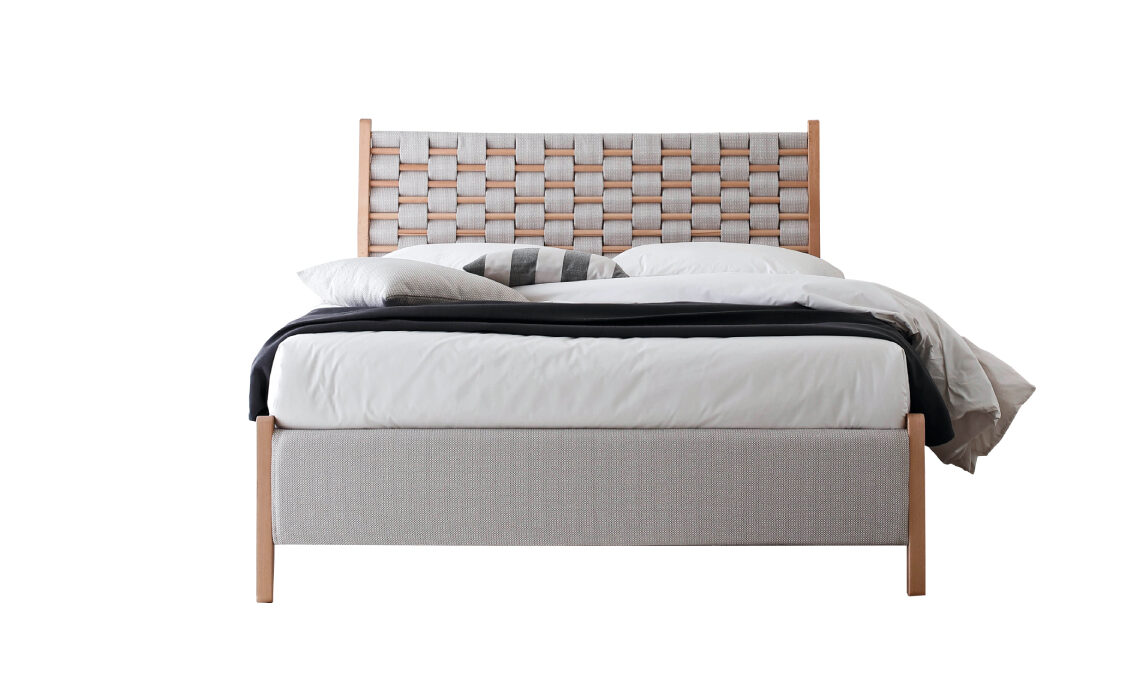 Letto Tolò 160 con struttura in legno di Faggio Natural, qui con tessuto Maratea montato in tensione sulla testata ma realizzabile in altre varianti del campionario [Noctis, cm 170,5x207x89h].