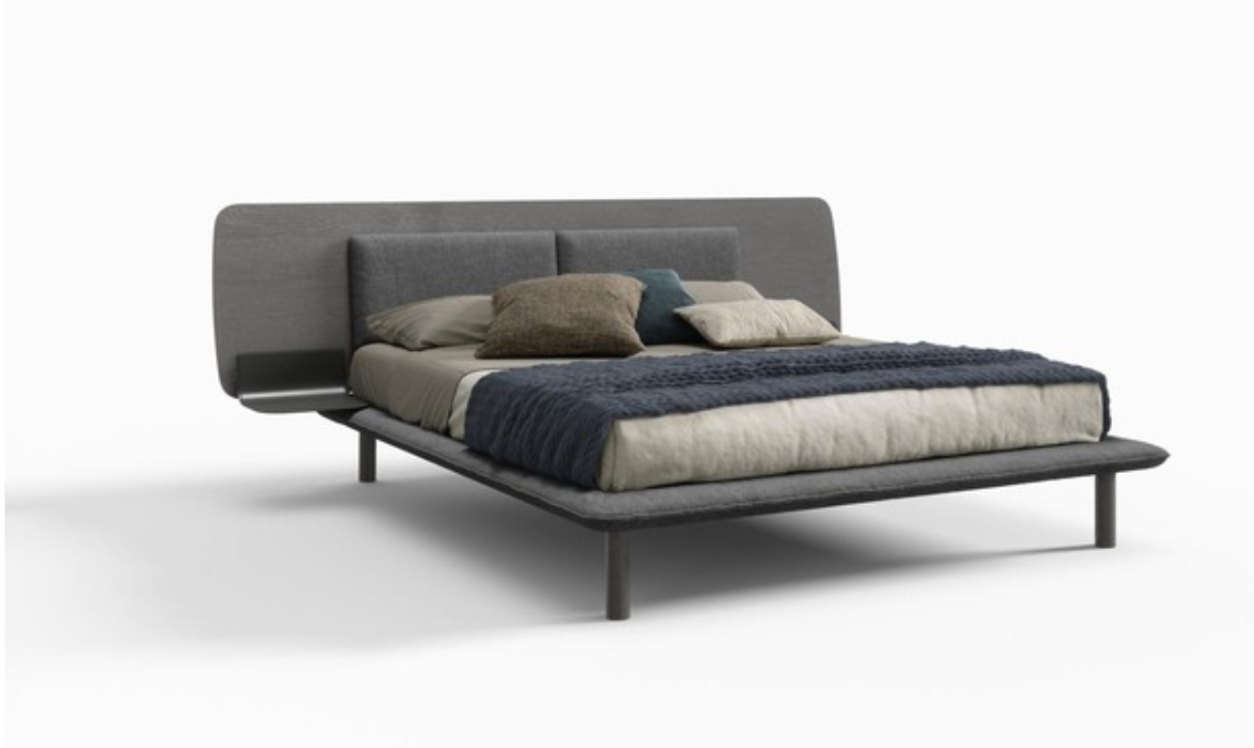 Letto personalizzabile Matisse, qui con giroletto imbottito e ampia testiera con funzionali lati sporgenti in legno finitura Rovere, resa comoda da due cuscini [Novamobili, misure e prezzo su richiesta].