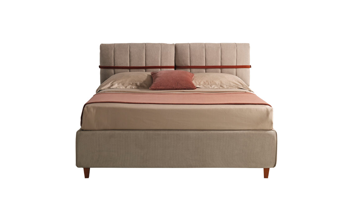 Letto contenitore sfoderabile Onda, con testata imbottita avvolta da due funzionali cinghie in tessuto ispirate alle antiche borse da viaggio [Perdormire, cm 160x190x112h].