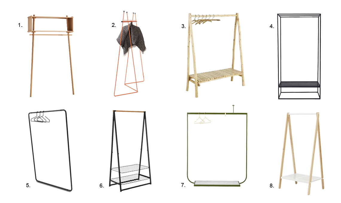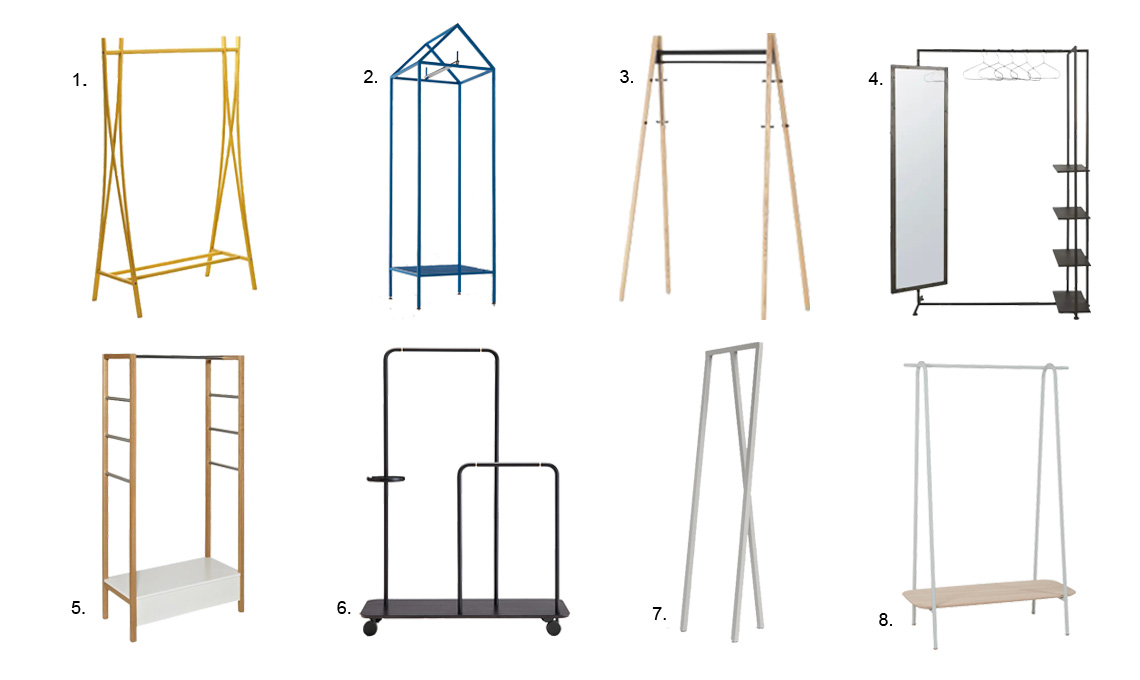 1. Töjbox [Woud, 112x38x200cm, €669], 2. Two Step [Inno, 100x46x179cm, €429], 3. Ikast [Maisons du Monde, 162x122x45.5cm, €199], 4. Grid Coat Stand [Kristina Dam Studio, 80x40x160cm, €524], 5. Curve [Schönbuch, 100x165x30cm, a partire da €333], 6. Organizer Appendiabiti Linn [Brabantia, 57x99.5x190cm, €159], 7. Tati appendiabiti piccolo [Asplund, 100x41.6x155cm, prezzo su richiesta], 8. Toj Clothes Rack Small [Normann Copenhagen, 160x79.5x59.5cm, €310].