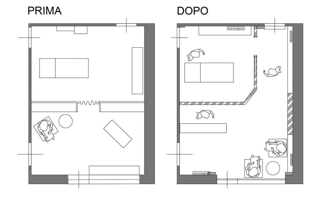 Prima la divisione era attuata con due librerie e una tenda e per accedere al retro del locale si passava attraverso la cabina a cui, dunque mancava privacy. Ora la creazione della cabina chiusa permette di raggiungere il retro attraverso un corridoio. In più la zona d'attesa e ricezione è più funzionale.