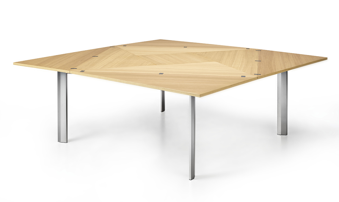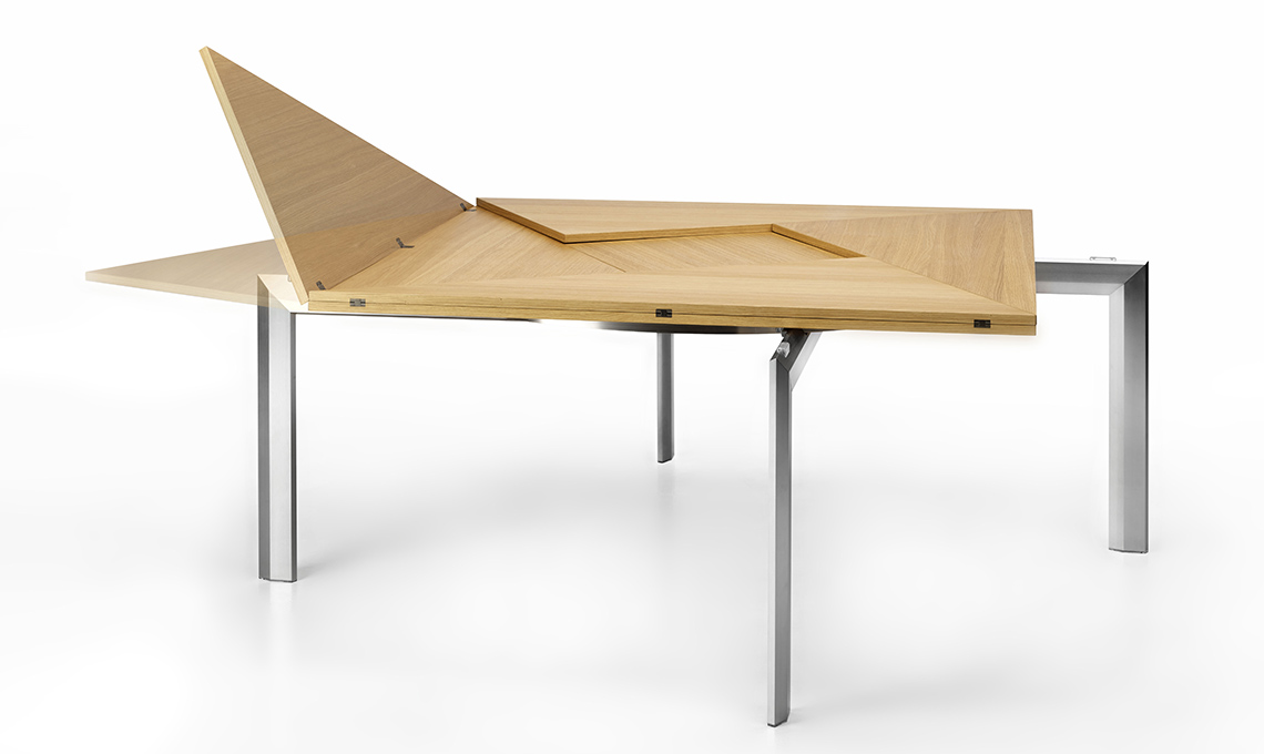Tavolo 'origami', BBB Il tavolo Square 2 Square ‘cresce’ con rotazione del pianoe apertura dei lati [BBB Italia, da cm 103x103 che diventa cm 140x140 e da cm 140x140 che diventa 191x191, prezzo su richiesta].