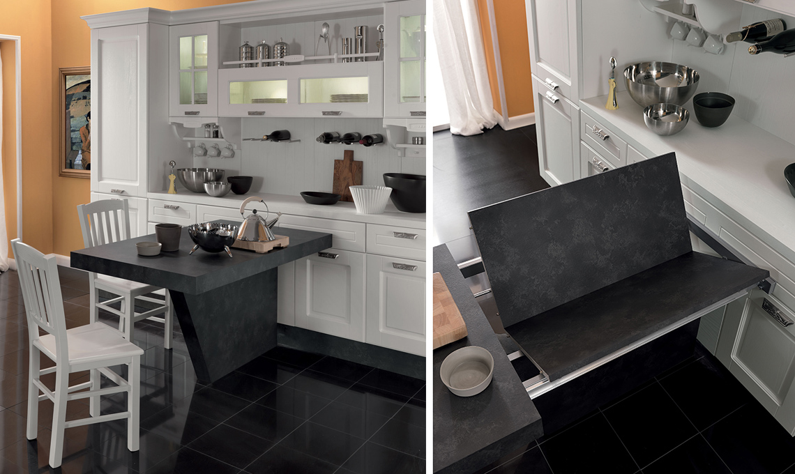 Tavolo apri-chiudi, Aran Cucine La penisola Shape della cucina Imperial si trasforma in un tavolo con prolunga di cm 80 [Aran Cucine, da cm 140x80 o cm 160x90 prezzo dal rivenditore].