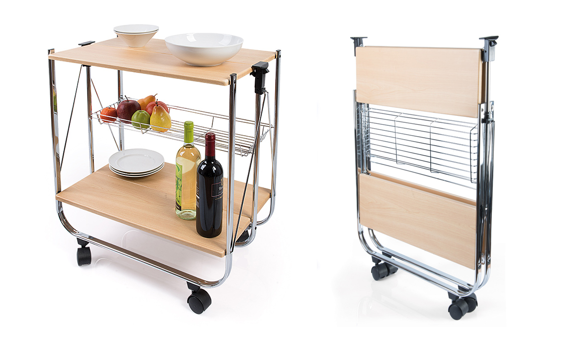 Carrello, Dmail Perfetto in cucina, con due piani in legno e un cestello in metallo, si richiude con un solo gesto [Dmail, chiuso cm 60x6,5x89h, aperto cm 60x40x70,5h €69,90].