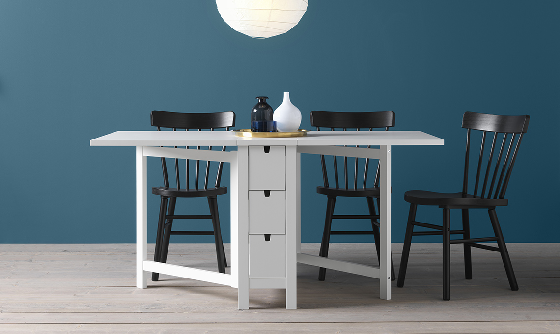 Tavolo a ribalta Norden per 2-4 persone, sotto il piano è dotato di 6 cassetti per tenere a portata di mano posate e tovaglioli [Ikea, cm 26/89/152x80x74h, €149,90].