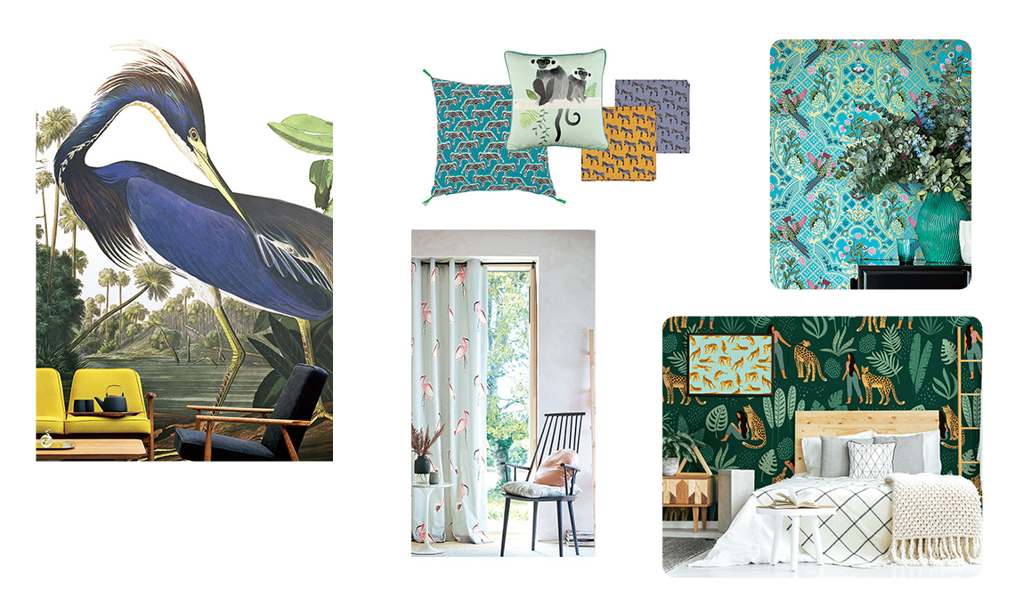 Set wallpaper in vinile Coraggioso e Selvaggio con donne, leopardi e foglie tropicali più poster con tigri [Pixers, cm 400x250 €290 e cm 60x40 €45].