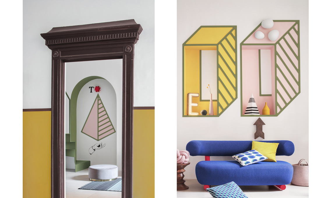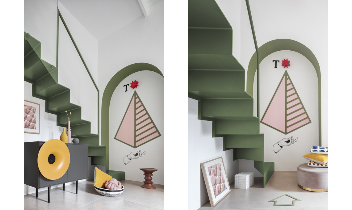 Sulla parete principale esistevano alcune grandi nicchie che apparivano come abbandonate sulla superficie del muro e che abbiamo scelto di rivitalizzare con il colore: in questo modo questi vani assumono quasi una nuova identità, cambiano totalmente aspetto e contribuiscono fortemente alla decorazione dell’ambiente. Usando il principio dello stencil, abbiamo quindi creato delle sagome geometriche che creano un’illusione optical, nella quale le nicchie diventano parte di un grande quadro fatto di molteplici geometrie colorate accostate tra loro. In questa composizione anche la scala, costruita attraverso l'apporto determinante di CPR Scale, non è solo una semplice successione di gradini ma un altro elemento geometrico di questo quadro, una simbolica rappresentazione dell'antico archetipo del "zigzag".