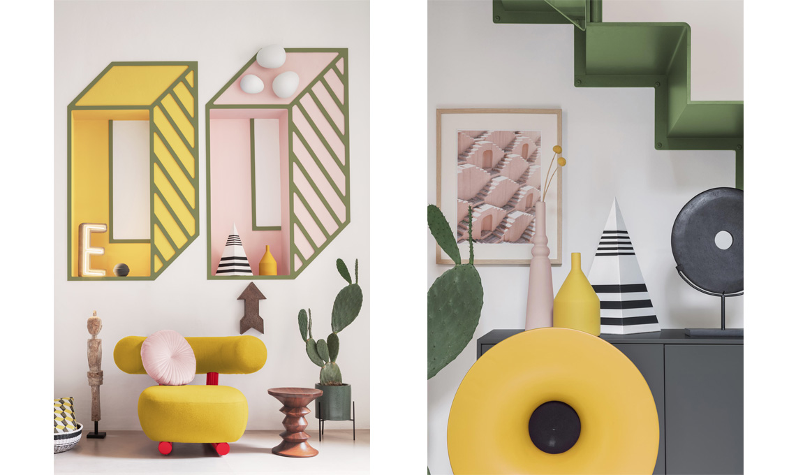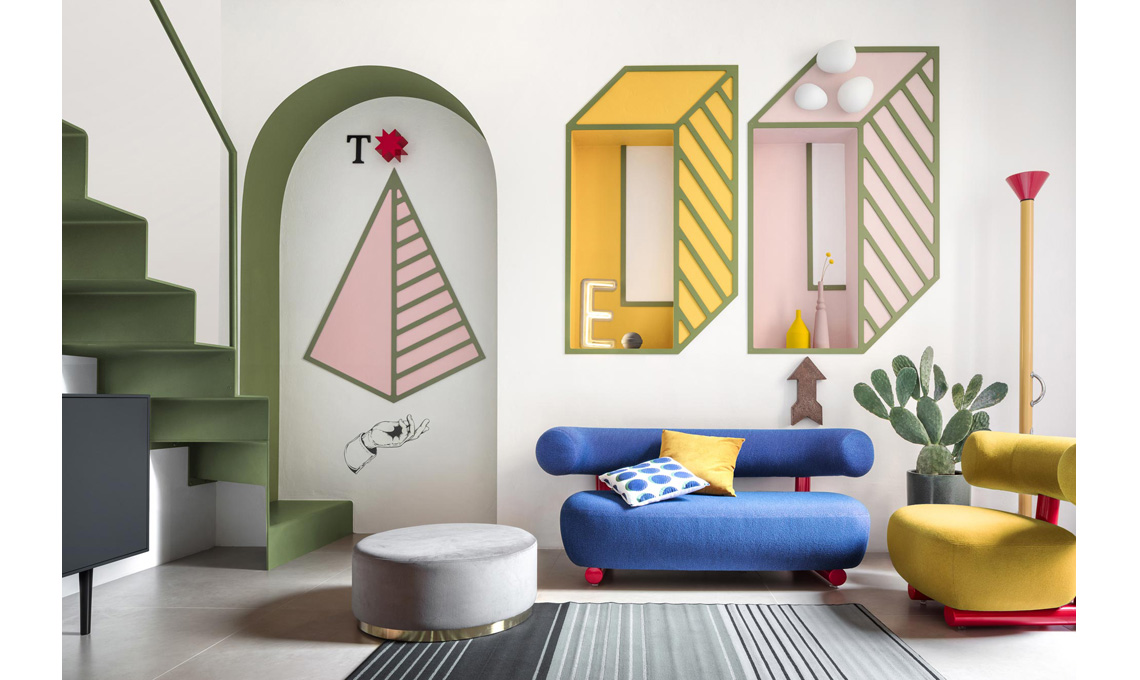 Il collettivo milanese Paradisiartificiali celebra questo anniversario nel progetto di una zona living che è un chiaro riferimento allo stile Memphis e all'estetica di quegli anni. Una scala verde in acciaio, nicchie e cornici coloratissime, oggetti e complementi d'arredo dallo stile eccentrico e una palette dai colori vivaci creano un’interpretazione teatrale della vita domestica.
