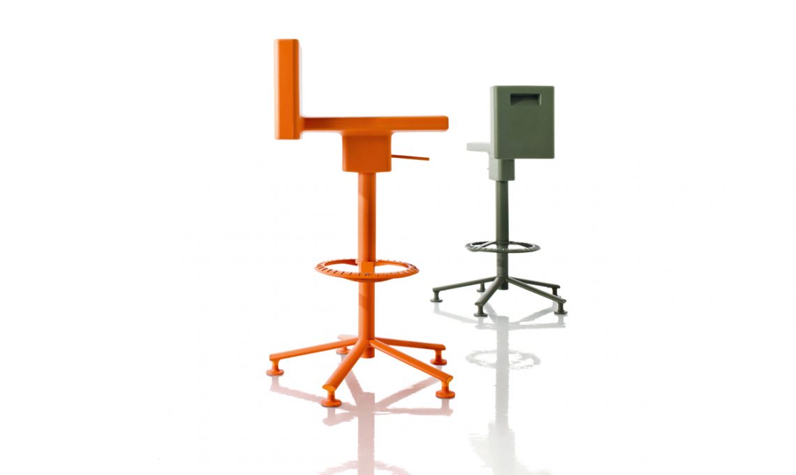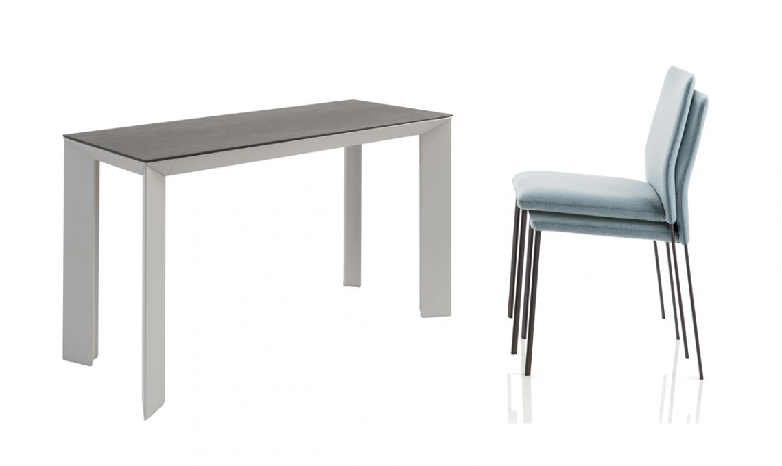 La consolle Manhattan si appoggia al muro e, quando serve, si apre per ospitare fino a 8 commensali da far sedere sulle sedie impilabili Stella [Riflessi, da cm 90x48/172x76h da €1.574 e cm 43,5x53x80h da €293 cad].