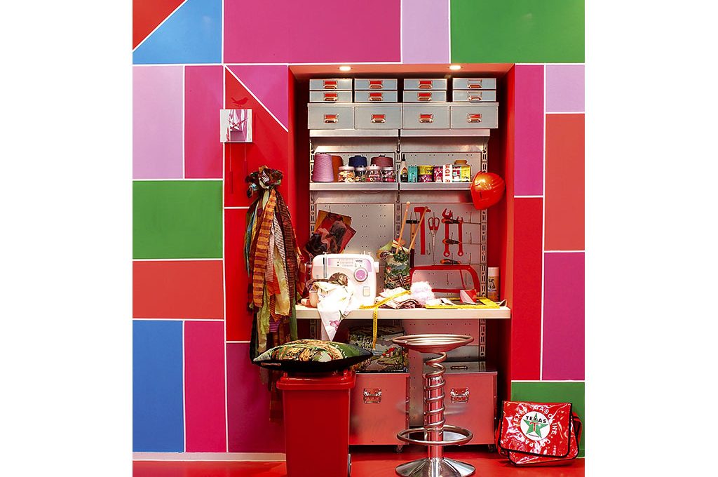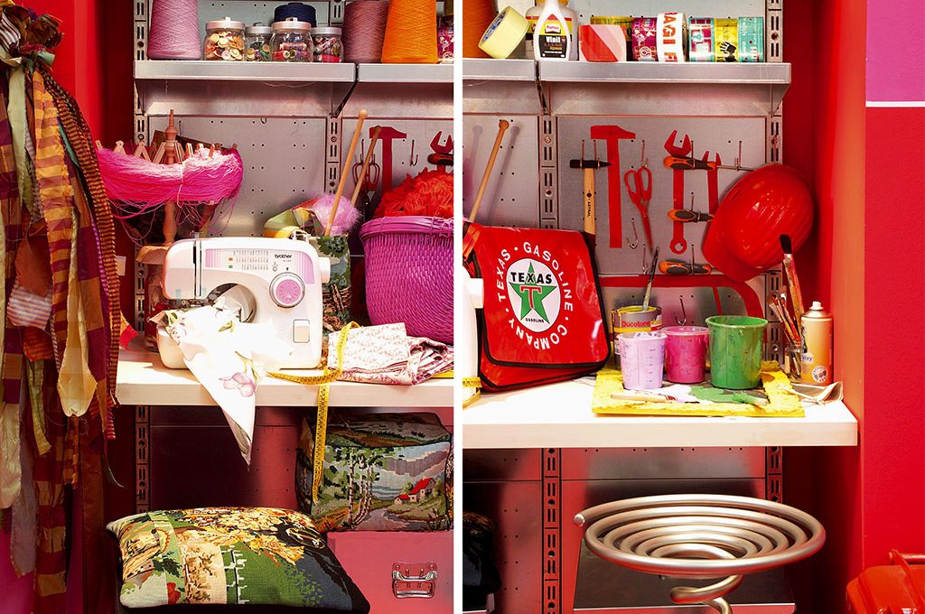 Una volta fissati i ripiani metallici e i ganci appenditutto alla boiserie, è arrivato il momento di riporre in perfetto ordine tutto quello che vi serve per i vostri “lavoretti”. In alto metti le scatole con i materiali più delicati o che usi meno di frequente (carte, stoffe, pennelli...), sulla seconda mensola tenete, ben divise, le cose di Lei e di Lui (rocchetti, gomitoli di lana, nastri adesivi, colle...). Infine al pannello verticale si appendono chiavi inglesi, martelli e seghe, da un lato, e cartamodelli più foto e ritagli ai quali ispirarsi dall’altro.