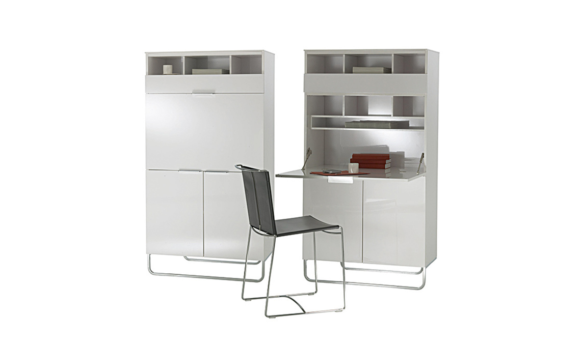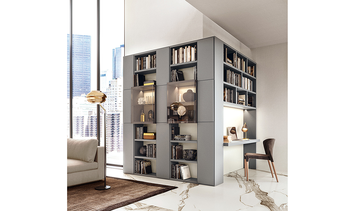 Lo scrittoio è parte integrante della composizione My Space, la libreria multifunzione dotata di ripiani e pensili aggettanti con ante in vetro trasparente grigio e luci a LED, progettata per sfruttare al centimetro l’angolo del living [Alf DaFrè, cm 227,5/195,5x 42,5x261,1h da €831 la colonna da cm 48x41,6x261,1h con 6 ripiani e 3 ante].