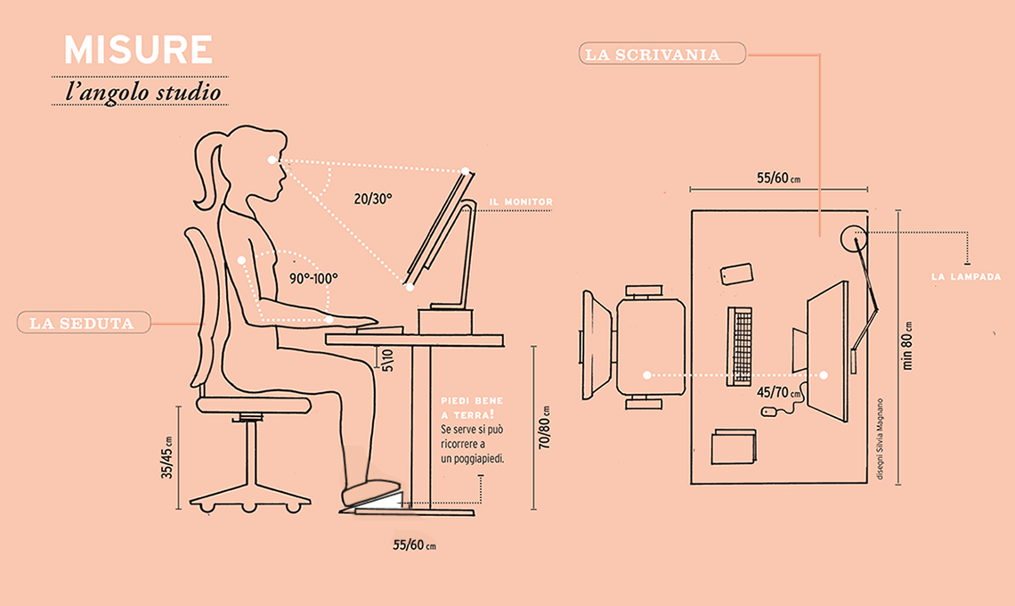 - Il monitor: il bordo superiore va leggermente sotto o in linea con l’altezza degli occhi, tenendo la testa dritta ma rilassata (se serve usa un rialzo). Tra gli estremi dello schermo e gli occhi deve esserci un angolo di 20/30°.