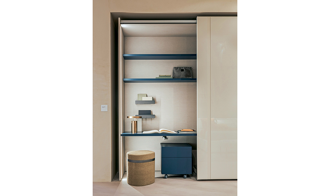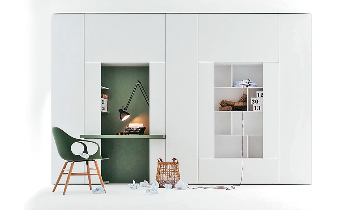 Se sei ordinata, puoi senza problemi tenere l’home office ben visibile all’interno dell’armadio. Come? Con un modulo aperto in un colore a contrasto con quello delle ante che abbia, oltre allo scrittoio, una serie di piani nascosti da ‘quinte’ nello spessore dell’armadio stesso. In foto, sistema Freedhome in laccato bianco e oliva [Caccaro].